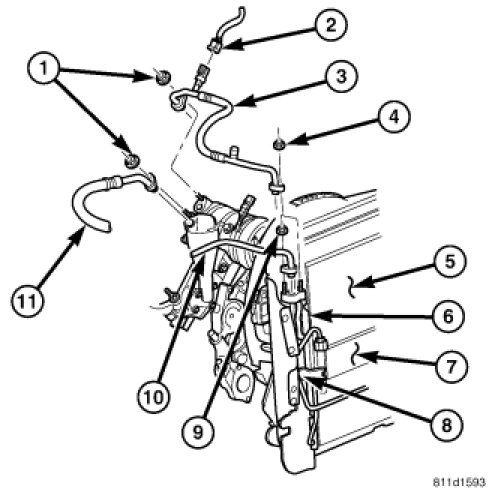 7. Connect the A/C liquid line (10) and the A/C discharge line (3) to the A/C condenser and install the retaining nuts (4 and 9). Tighten the nuts to 22.5 Nm (200 in. lbs.).