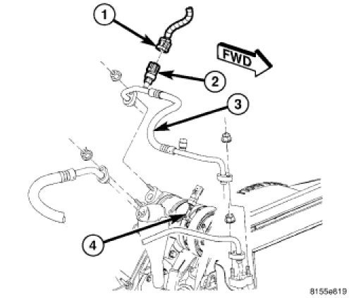 2. Install the A/C pressure transducer (2) onto the A/C discharge line (3) near the A/C compressor (4). Hand-tightened the transducer securely.