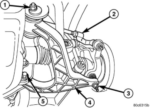 Camber and caster angle adjustments involve changing the position of the lower control arm cam bolts (1&5).