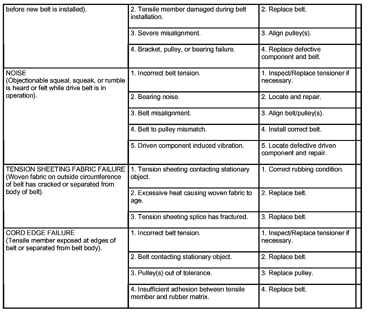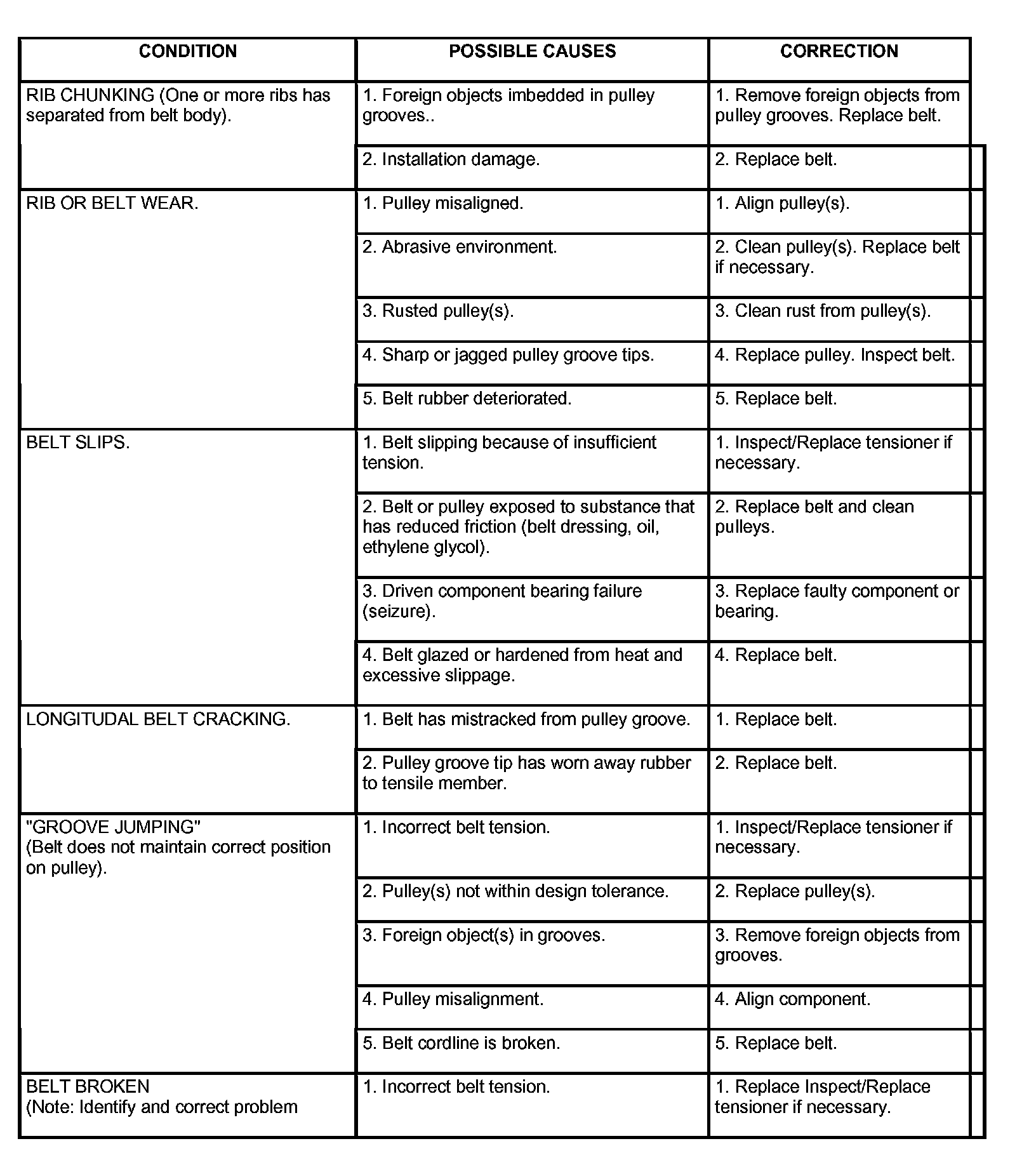 Noises generated by the accessory drive belt are most noticeable at idle. Before replacing a belt to resolve a noise condition, inspect all of the accessory drive pulleys for alignment, glazing, or excessive end play.