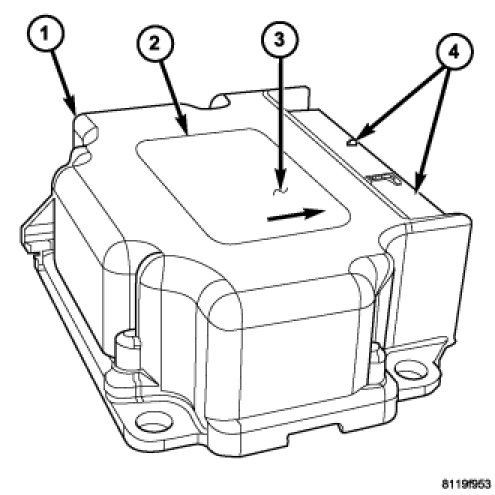 An arrow (3) printed on the label (2) on the top of the ACM housing provides a visual verification of the proper orientation of the unit, and should always be pointed toward the front of the vehicle. The ACM housing has integral mounting flanges on three corners. The mounting flange to the right of the connector receptacle has an integral locating pin on its lower surface. Both right side flanges have round mounting holes, while the flange on the left side has a slotted mounting hole. A molded plastic electrical connector (4) with two receptacles, one containing twenty-four terminal pins and the other containing thirty-two terminal pins, exits the forward facing side of the ACM housing. These terminal pins connect the ACM to the vehicle electrical system through two dedicated take outs and connectors, one from the instrument panel wire harness and the other from the body wire harness.