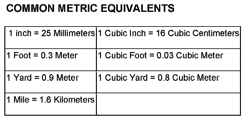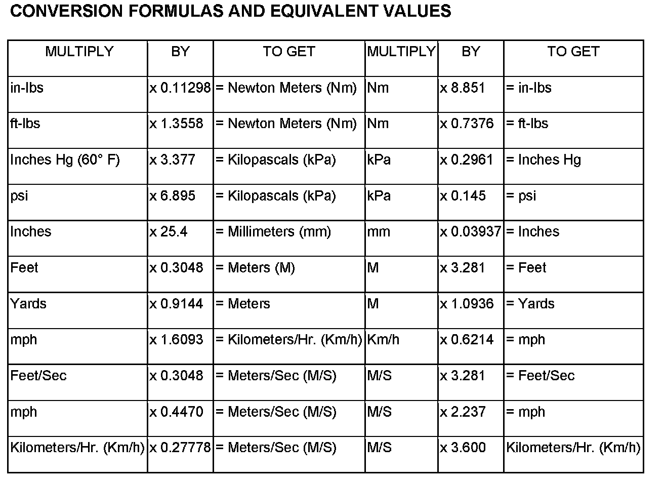The following chart will assist in converting metric units to equivalent English and SAE units, or vise versa.