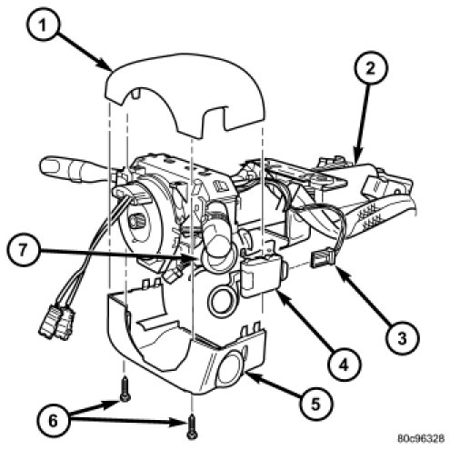 3. Slide the SKREEM antenna ring around the ignition switch lock cylinder housing (7), then rotate the SKREEM and its mounting bracket upwards and toward the steering column.