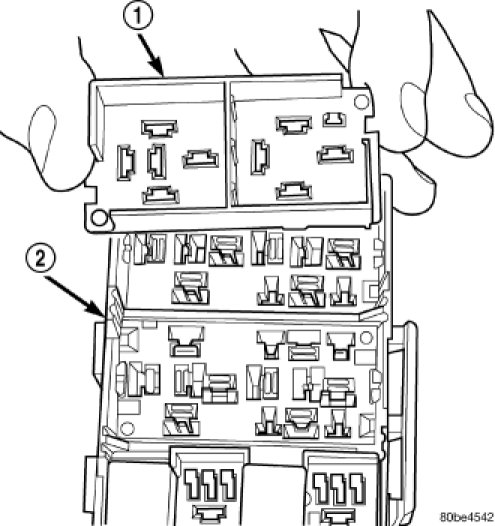 1. From the top of the PDC housing (2), align and insert the PDC relay wedge (1) latch arms into the correct cavities in the relay cassette.