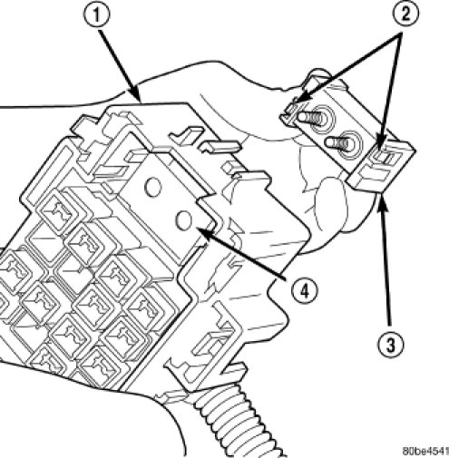 4. While pulling gently on the wire from the bottom of the faulty PDC relay cassette (2), use a terminal pick tool (4)(Special Tool Kit 6680) from the top of the relay cassette to release the latch (3) that secures the terminal in the relay cassette terminal cavity (1).