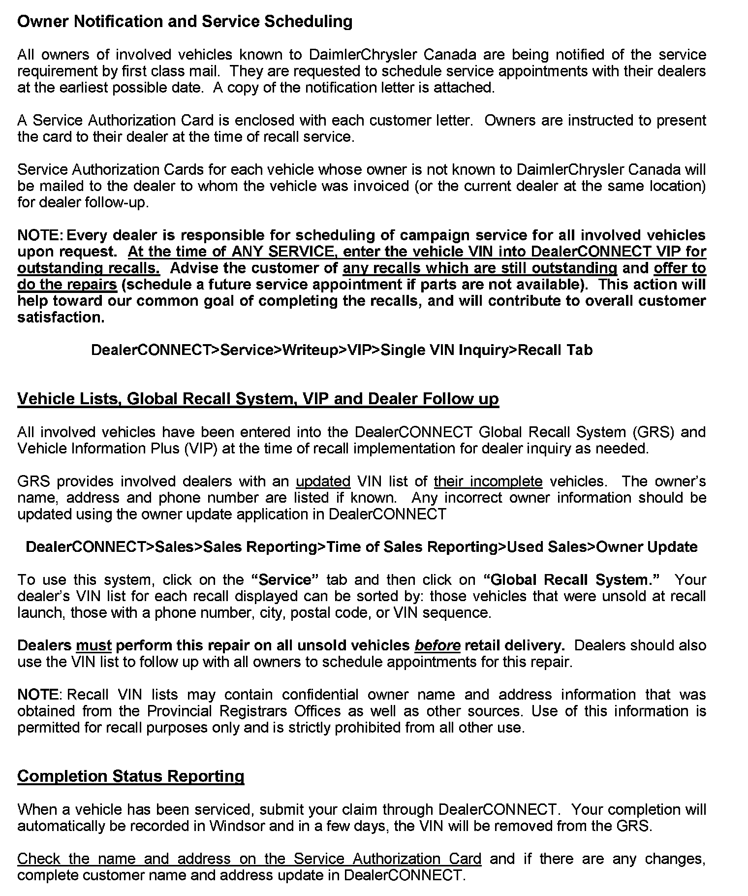 Global Recall System (GRS) has been developed to provide dealers with an up-to-date list of involved vehicles by recall number and by dealer code. Owners known to DaimlerChrysler are also listed. Involved vehicles will be removed from GRS within several days of submitting repair claims.