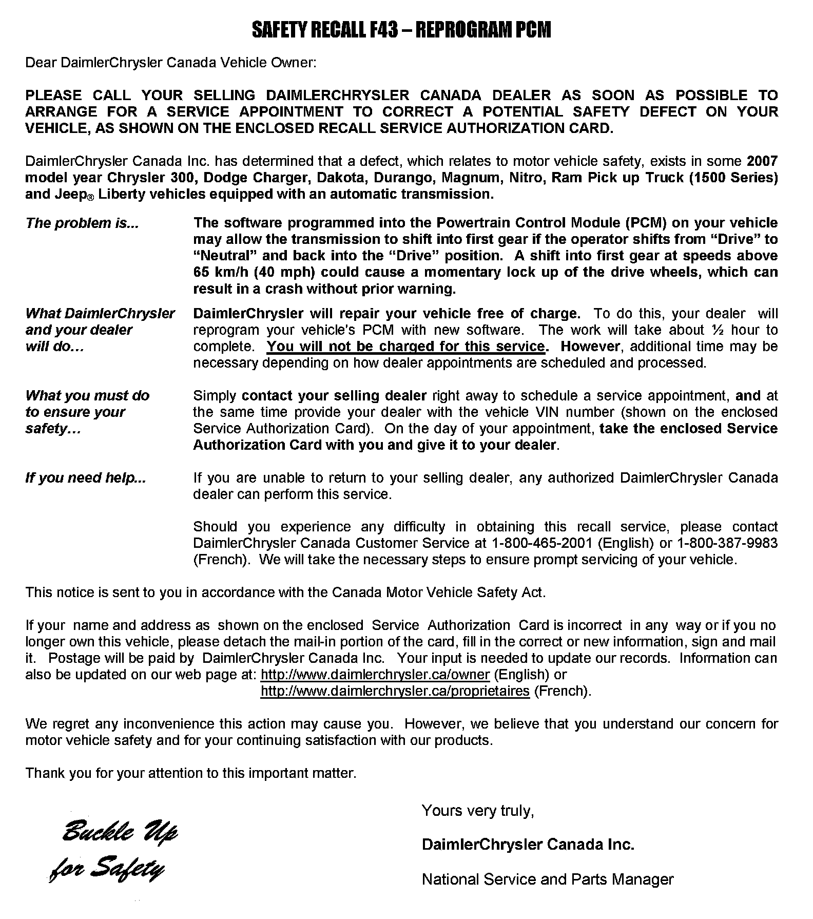 ^ The software programmed into the Powertrain Control Module (PCM) on about 350 of the above vehicles may allow the transmission to shift into first gear if the operator shifts from "Drive" to "Neutral" and back into the "Drive" position. A shift into first gear at speeds above 65 km/h (40 mph) could cause a momentary lock up of the drive wheels, which can result in a crash without prior warning.