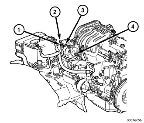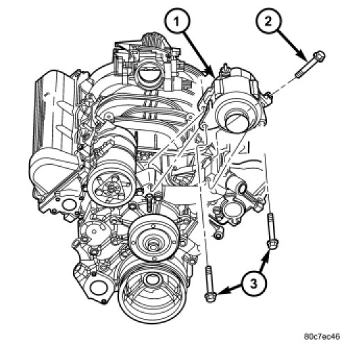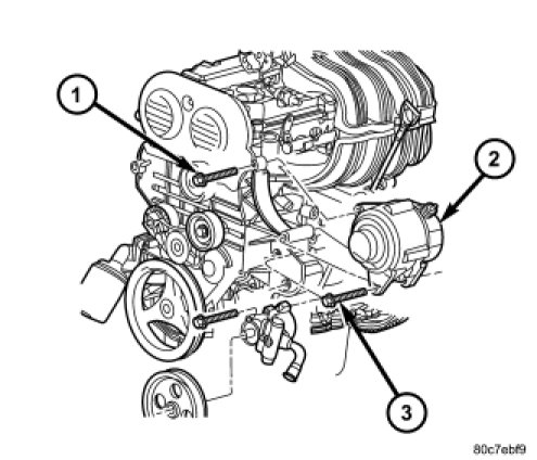 2. 3.7L Engine: Position generator to engine and install three mounting bolts (2) and (3). Tighten 2 horizontal mounting bolts to specified torque. Tighten 1 vertical mounting bolt and tighten to 40 Nm (29 ft. lbs.)