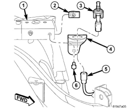 3. From the top of the mounting bracket (4) in the left front corner of the engine compartment, squeeze the two hood ajar switch (3) latch tabs together and pull the switch upward.