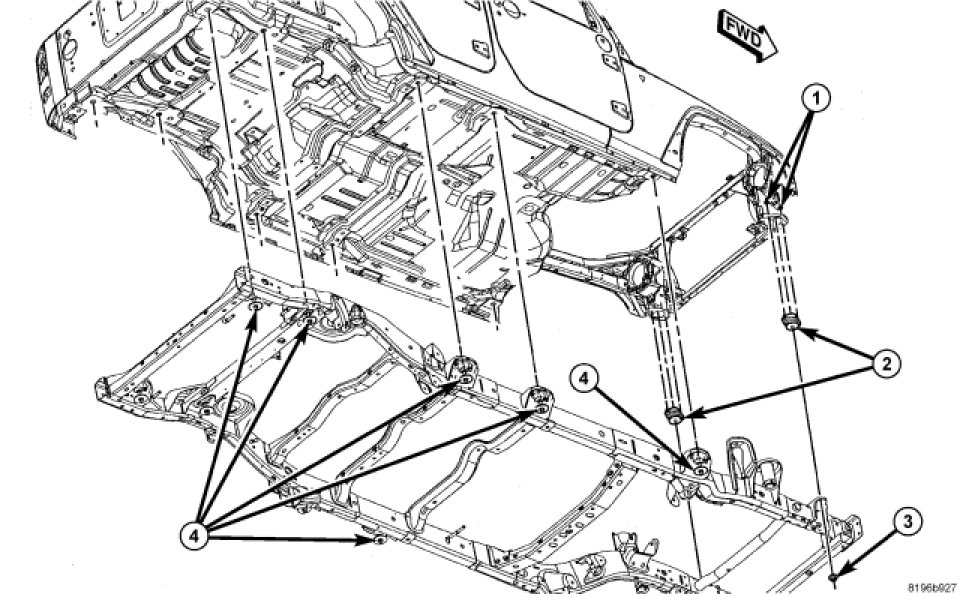 4. Using a floor jack and wooden block under the body sill, lift the body to gain access to the isolators and remove the isolators as necessary.