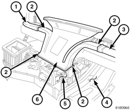 1. Position the defroster duct (6) to the top of the HVAC housing assembly (5).