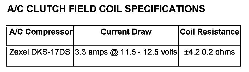 6. Refer to the A/C Clutch Field Coil Specifications chart for the acceptable A/C clutch coil resistance. Specifications apply for a work area temperature of 25° C (77° F).