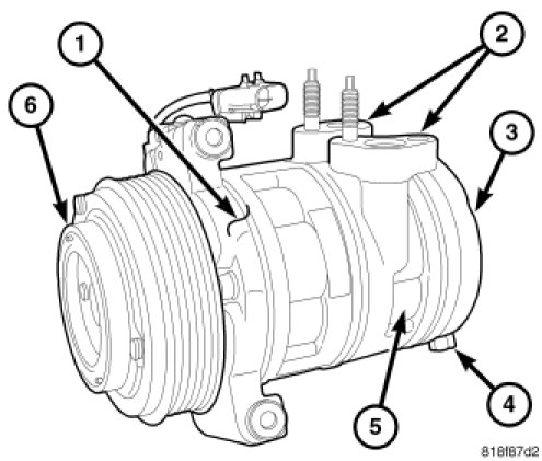 This A/C system uses a Zexel DKS-17DS ten cylinder, double-acting swash plate-type A/C compressor (1). This A/C compressor has a fixed displacement of 175.5 cubic centimeters (10.7 cubic inches) and has the suction and discharge ports (2) located on the compressor cylinder block (5).
