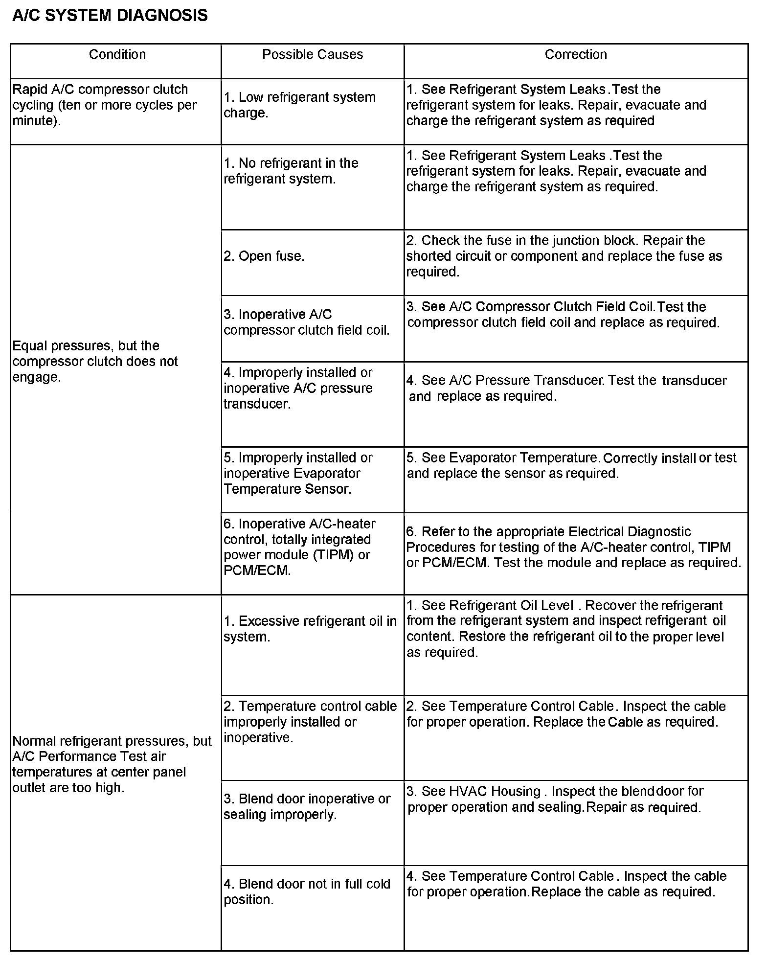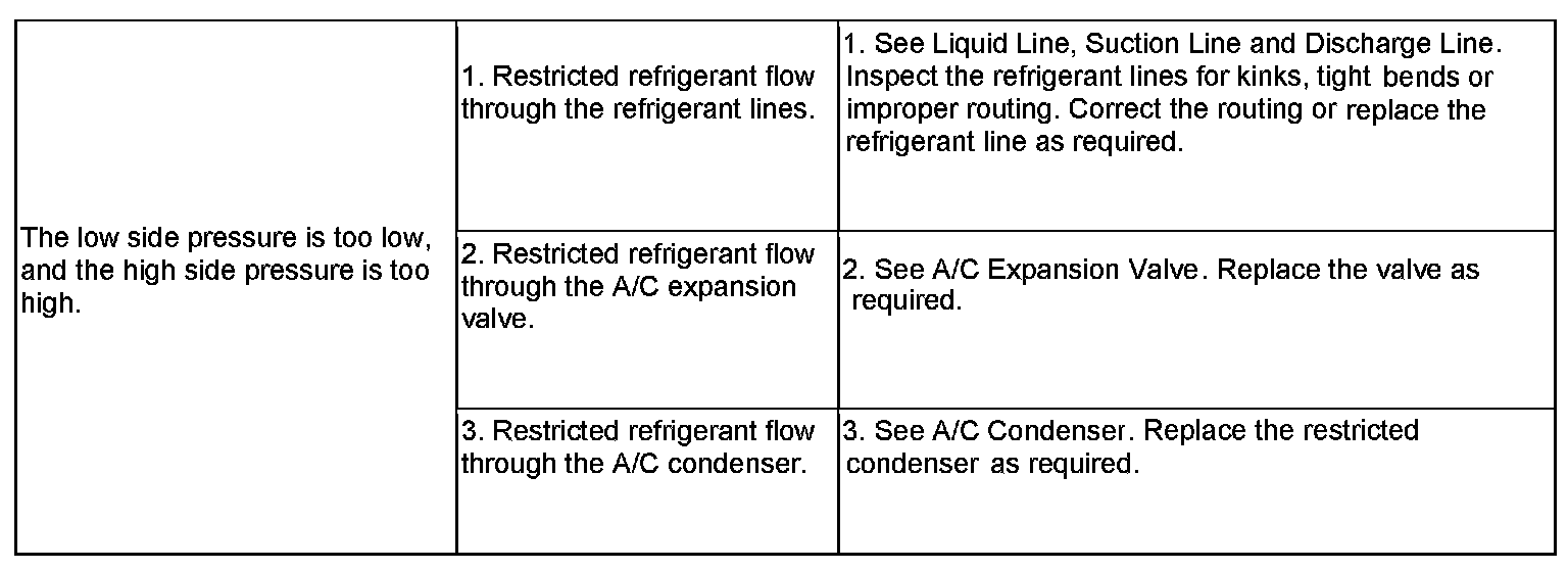 6. If the air outlet temperature fails to meet the specifications in the A/C Performance Temperature and Pressure chart, or if the A/C compressor discharge pressure is high, refer to the A/C System Diagnosis chart.