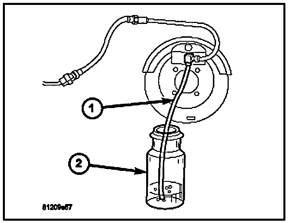 Warning: When bleeding the brake system wear safety glasses. A clear bleed tube (1) must be attached to the bleeder screws and submerged in a clear container filled part way with clean brake fluid (2). Direct the flow of brake fluid away from yourself and the painted surfaces of the vehicle. Brake fluid at high pressure may come out of the bleeder screws when opened.