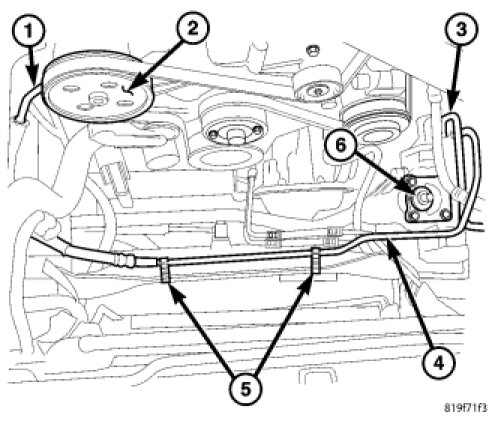 The pressure hose (4) consists of two metal ends two rubber sections and one center metal section. The hose connects to the gear box (6) and to the power steering pump (1).