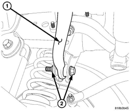 5. It may be necessary to pry the axle assembly over to install the track bar (1) at the frame rail. Install track bar at the frame rail bracket. Install the nut and bolt (2) at the frame rail bracket.
