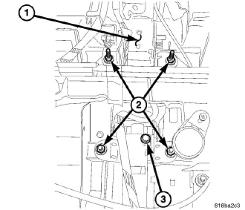 9. Remove the steering coupler bolt and column mounting nuts (2) then lower column (1) off the mounting studs.