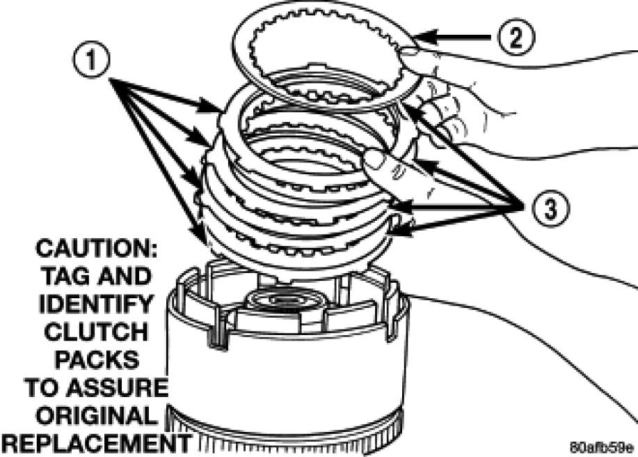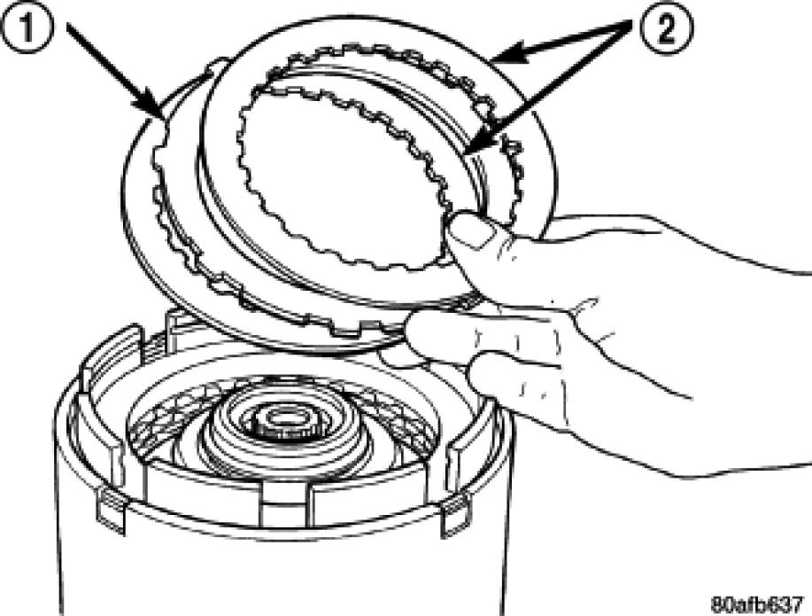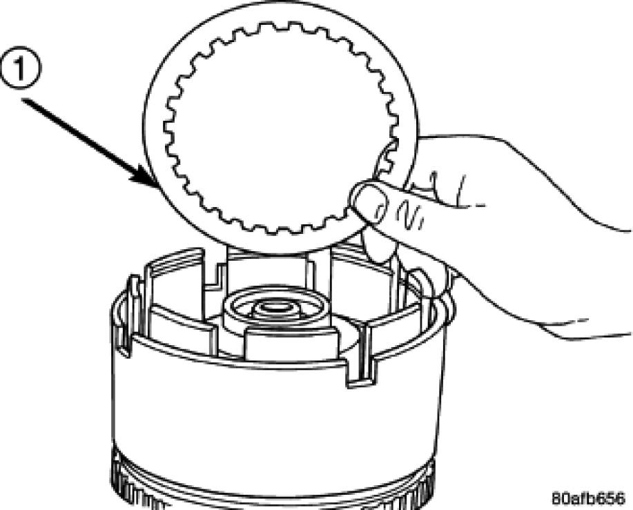 24. Install the OD clutch pack (four fibers/three steels) (1).