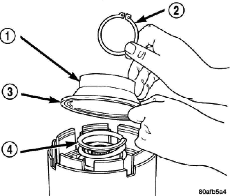 10. Position the UD spring retainer (1) and snap ring (2) on the piston return spring (4).