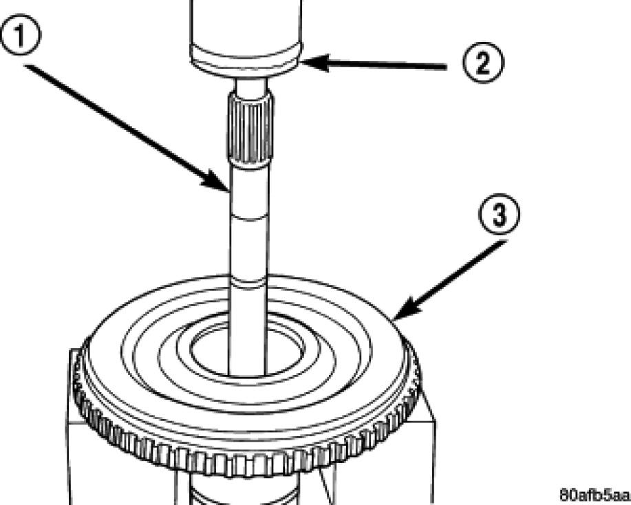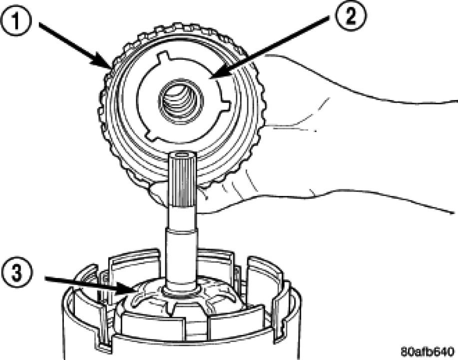 43. Install the number 3 thrust plate (3) to the bottom of the overdrive shaft assembly (1). Retain with petrolatum or transmission assembly gel (2).