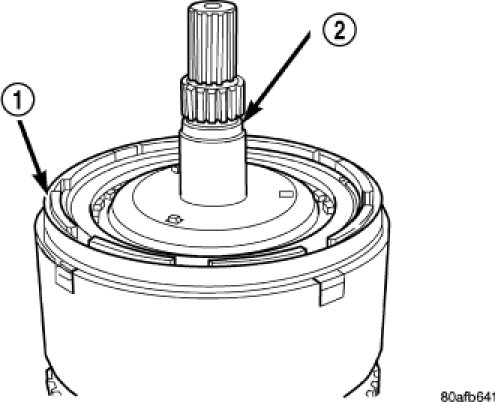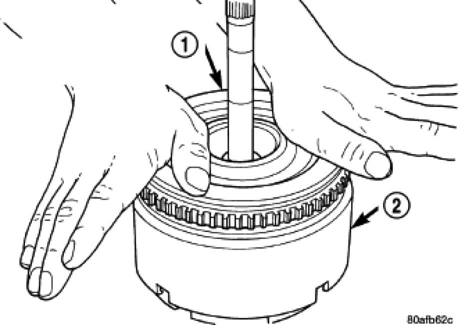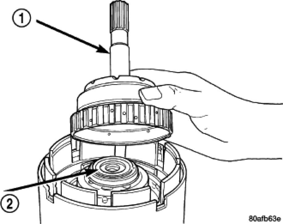 6. Install the input hub/shaft assembly (1) to the OD/Reverse piston/clutch retainer assembly (2).