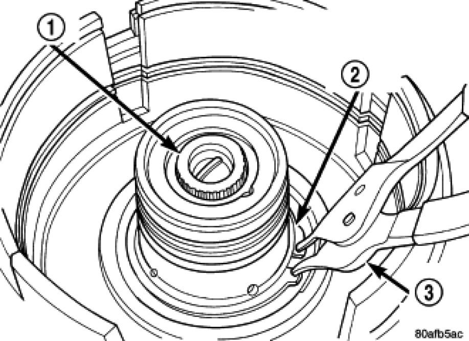 33. Tap reaction plate (3) down to allow installation of the reverse clutch snap ring (1). Install reverse clutch snap ring (1).