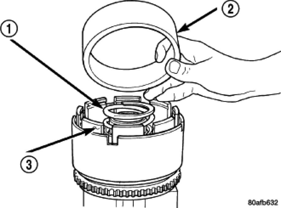 3. Position the OD/Reverse piston return spring (2) and snap ring (3) onto the OD/Reverse piston (1).