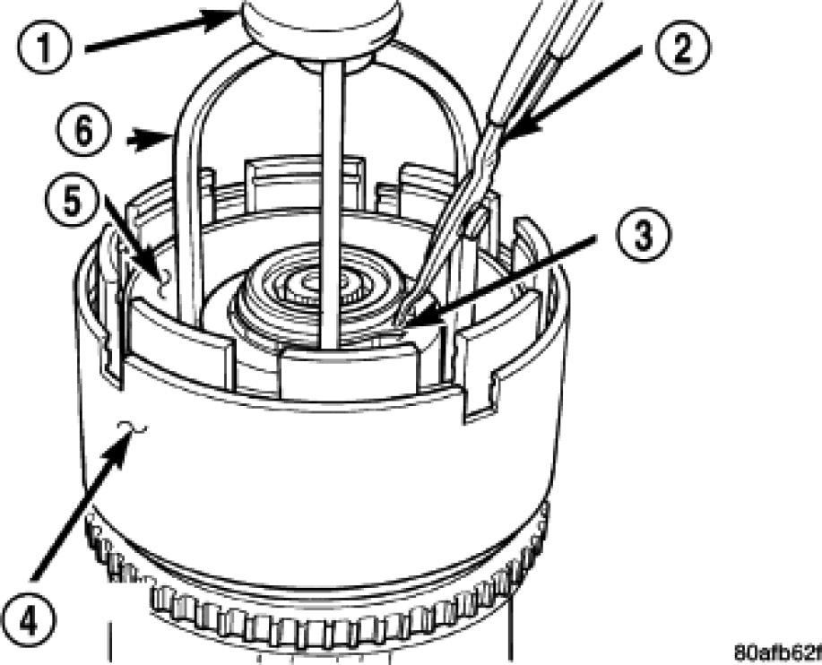 4. Using an arbor press (1) and Disc 6057 (4), install the OD/Reverse piston return spring (6) and snap ring (3).
