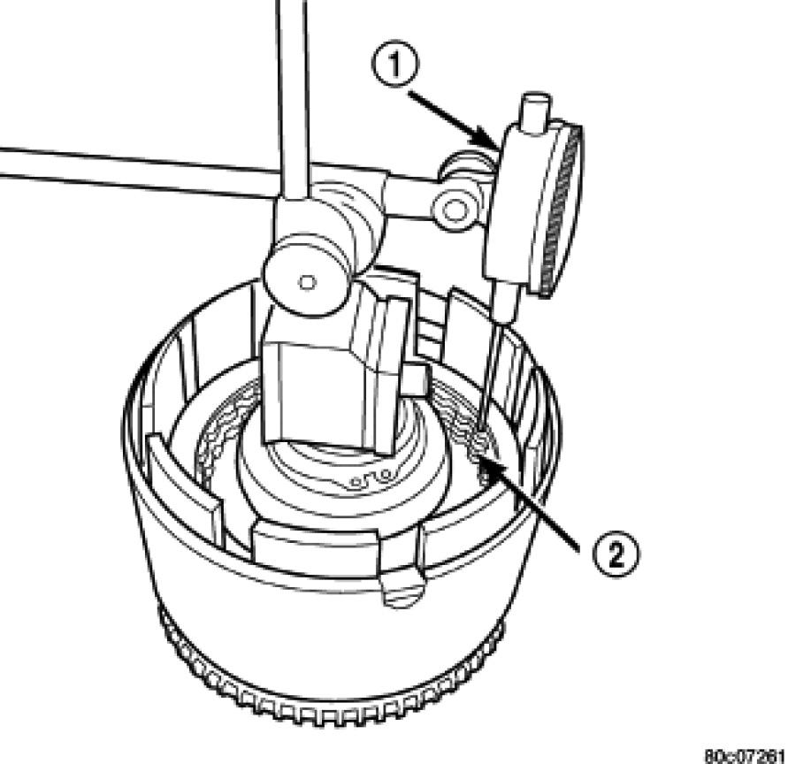20. Using moderate pressure, press down and hold (near indicator) the UD clutch pack (2) with screwdriver or suitable tool and zero dial indicator (1). When releasing pressure on clutch pack, indicator reading should advance 0.005-0.010 inches.