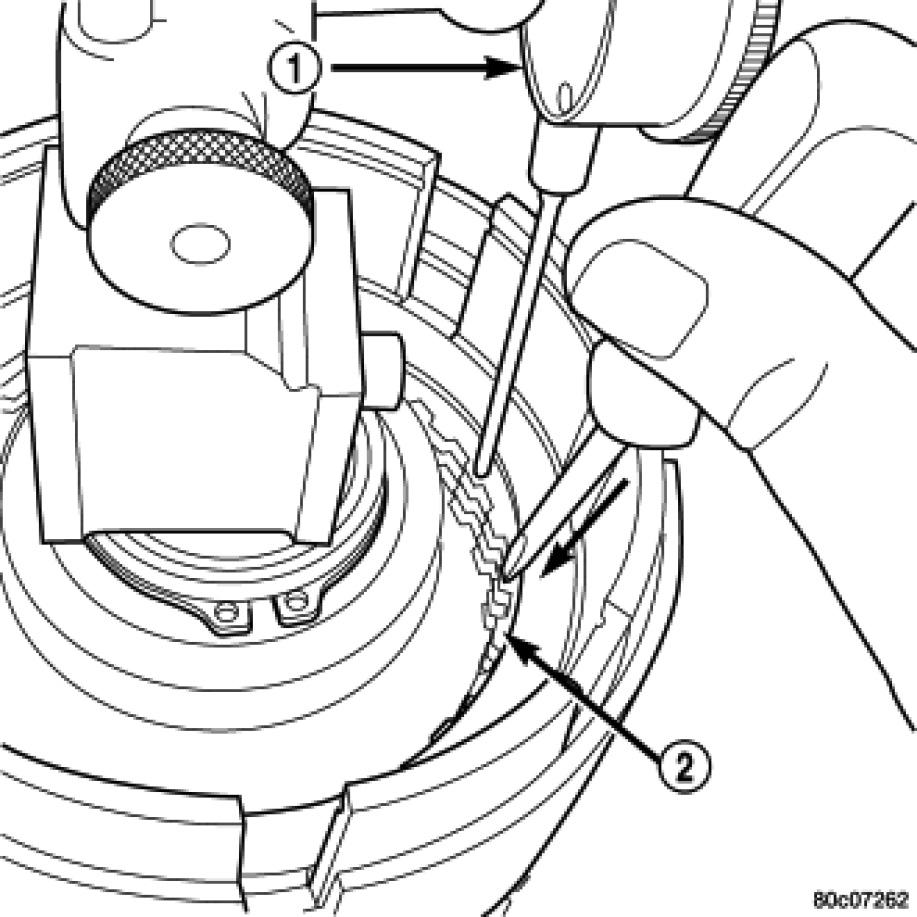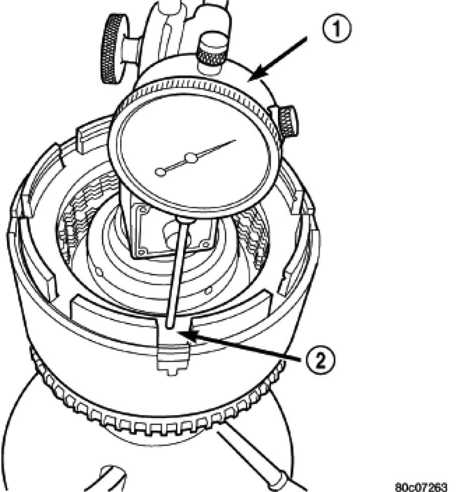 36. Using moderate pressure, press down and hold (near indicator) reverse clutch disc (2) with screwdriver or suitable tool and zero dial indicator (1). When releasing pressure, indicator should advance 0.005-0.010 inches as clutch pack relaxes.
