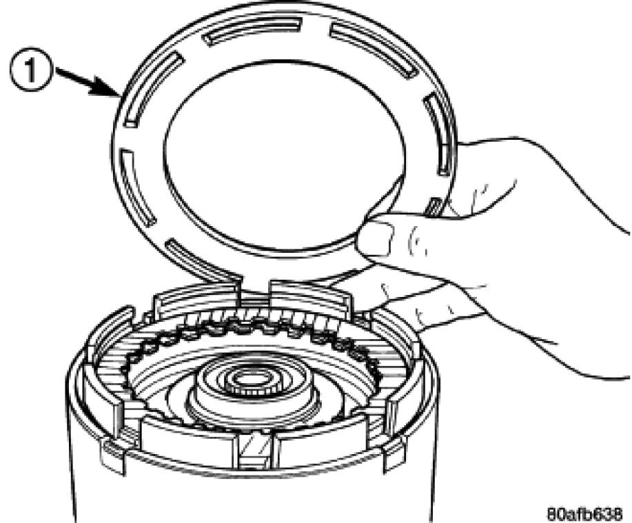 15. Install the OD/UD clutch reaction plate (1). The OD/UD clutches reaction plate has a step on both sides. Install the OD/UD clutches reaction plate tapered step side up.