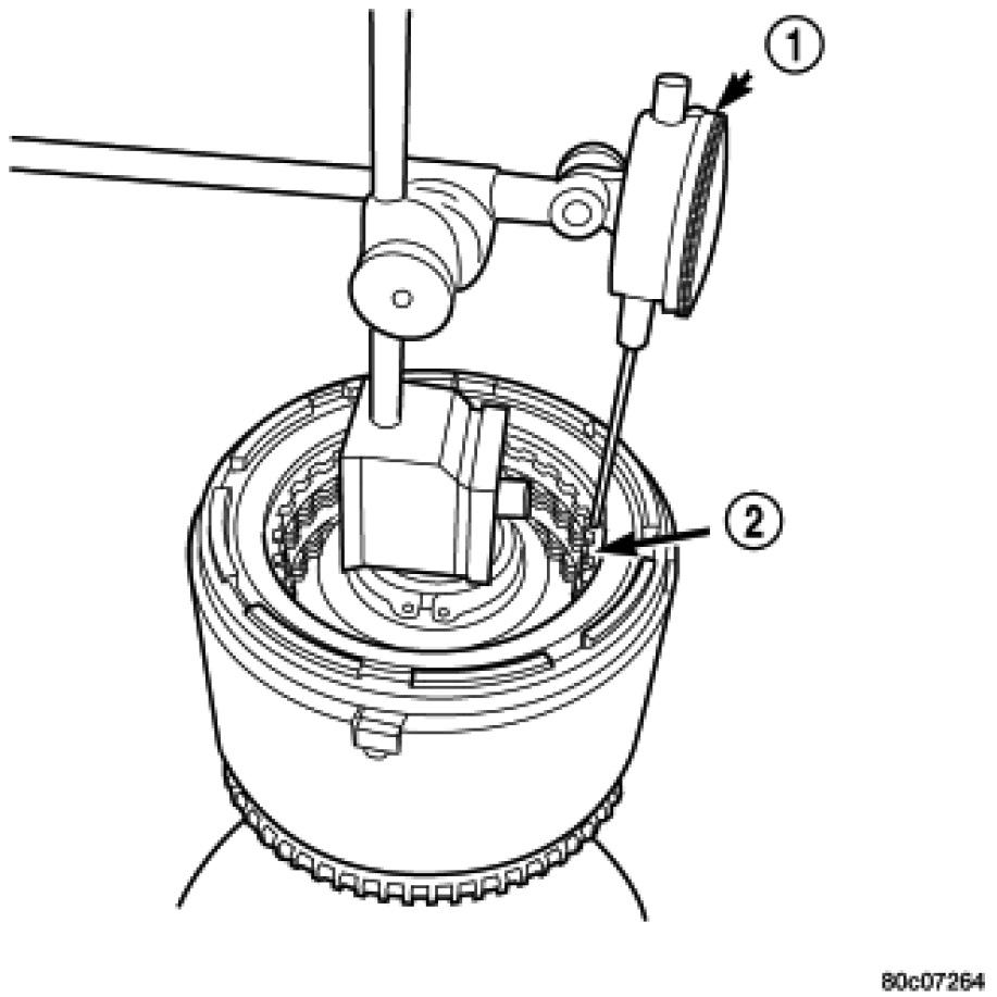 19. Set up dial indicator (1) on the UD clutch pack (2).