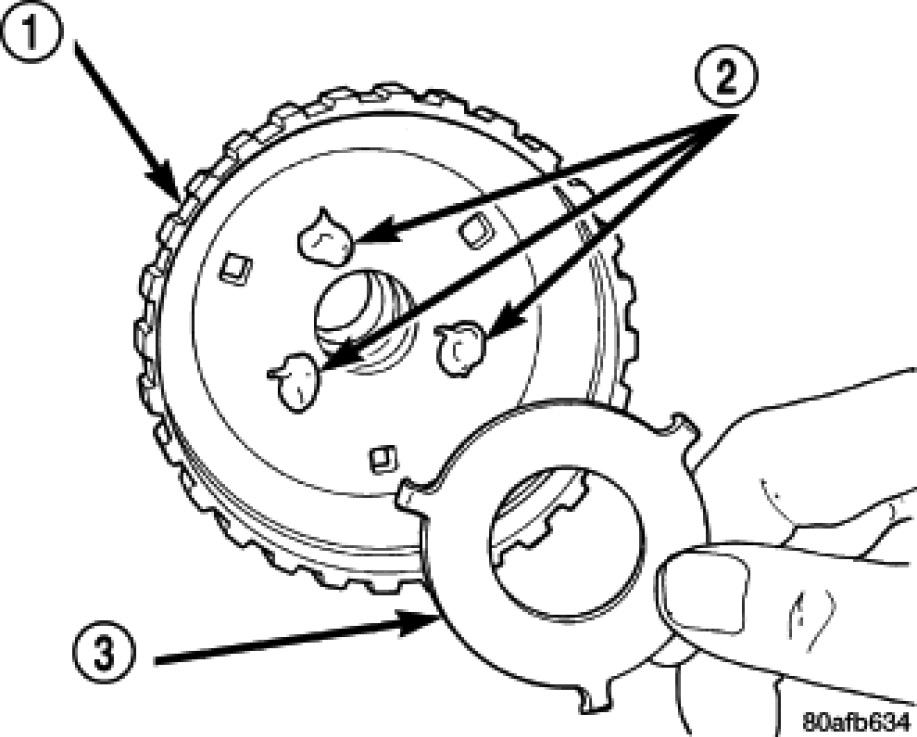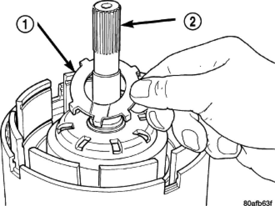 42. Install the number 3 thrust washer (1) to the underdrive shaft assembly (2). Be sure five tabs are seated properly.