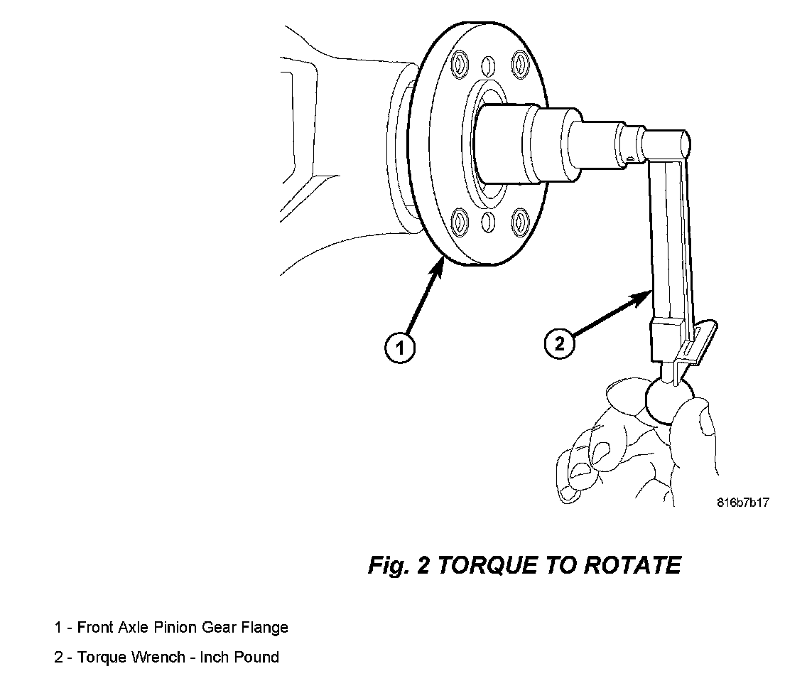 8. Continue tightening the pinion flange nut in 6.8 Nm (5 ft. lbs.) increments and obtaining a "Total Torque To Rotate measurement using the correct procedure to obtain the measurement (Fig 2).