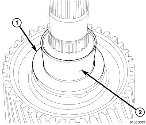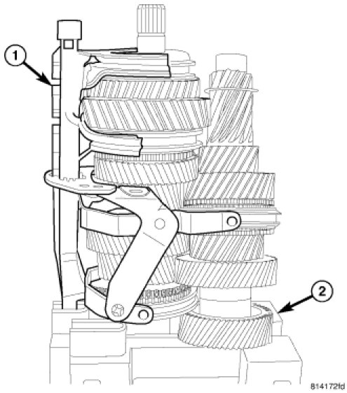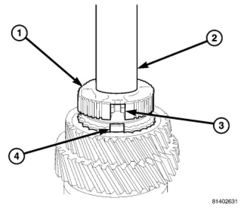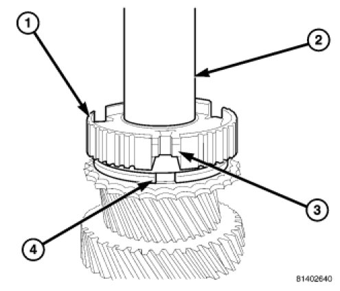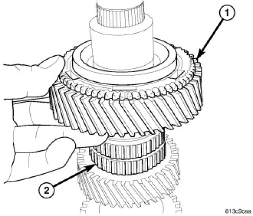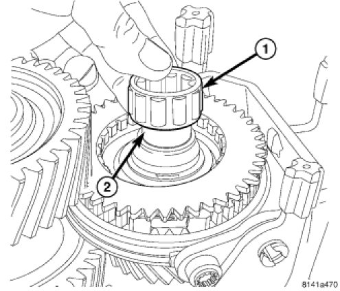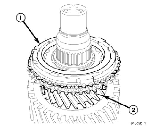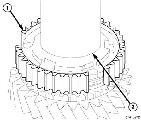 21. Install reverse gear (1) synchronizer sleeve (2) with tooth points pointing down and center sleeve on synchronizer hub.