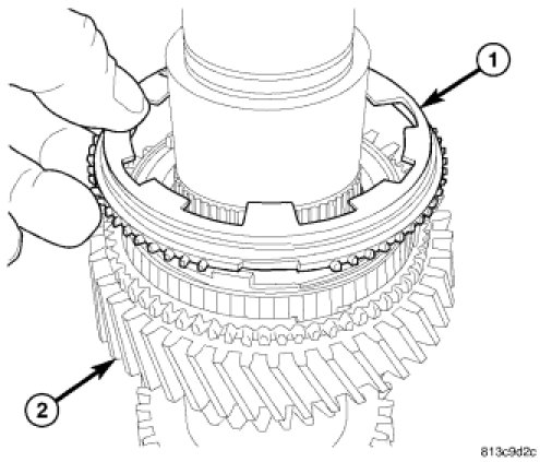 9. Install fifth gear blocker ring (1) on 5-6 synchronizer hub (2). Then hold blocker ring and center synchronizer sleeve.