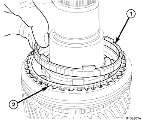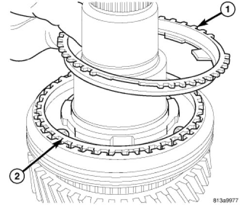 24. Install sixth gear synchronizer blocker ring (1) on sixth gear (2).
