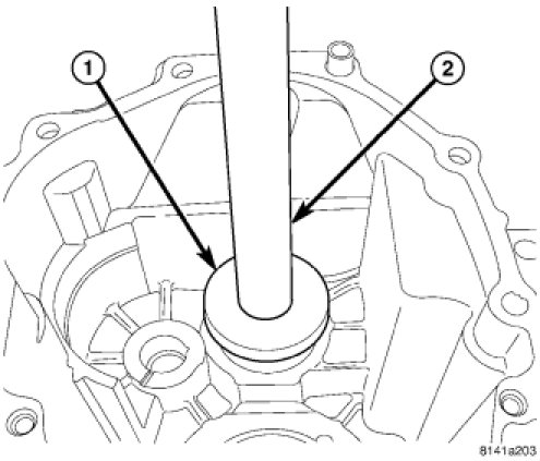 10. Install 4x4 output shaft seal into rear housing (1) with Installer 9638 (2). Install 4x2 output shaft seal into rear housing with Installer 9635 and Installer 6448A.