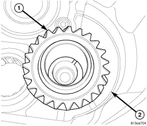 6. Install idler gear (1) thrust washer (2) on idler gear.
