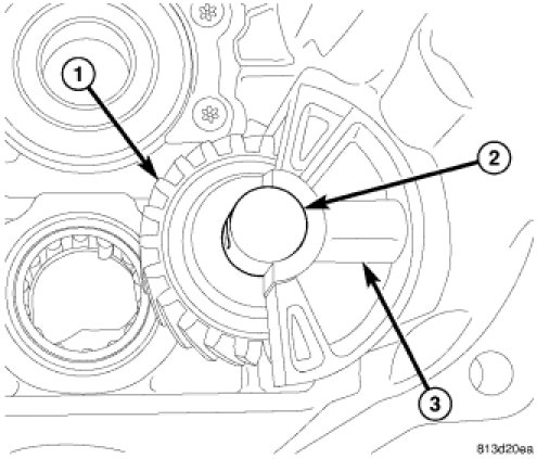 8. Install idler gear (1) shaft (2) with shaft bolt hole aligned with shaft support hole (3).
