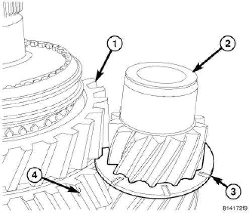 3. Install oil slinger (3) on countershaft (2) between reverse (1) and first gear (4).