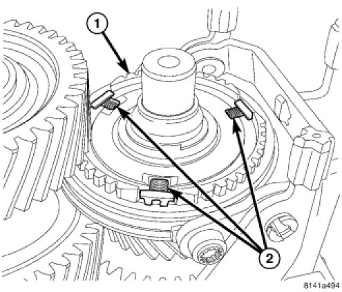 20. Install reverse gear synchronizer hub (1) detents (2).