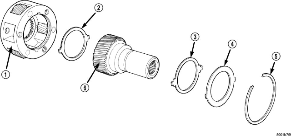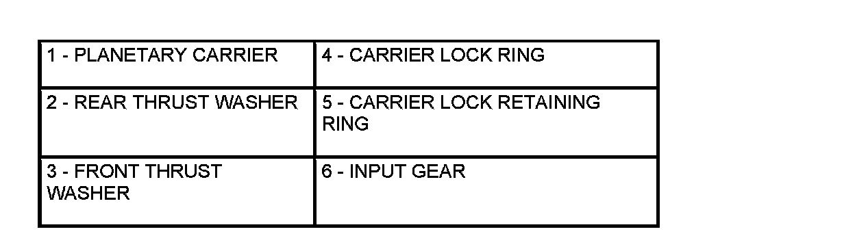 Check the carrier lock ring (4) and both thrust washers (2, 3) for wear or cracks. Replace them if necessary. Also replace the carrier lock retaining ring (5) if bent, distorted, or broken.