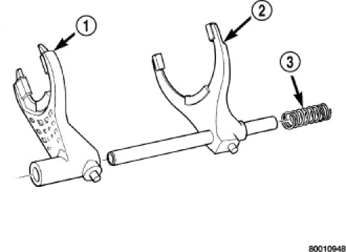 Check condition of the shift forks and mode fork shift rail (2). Minor nicks on the shift rail can be smoothed with 320-400 grit emery cloth.