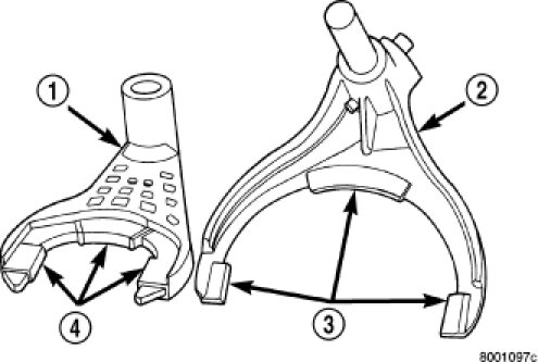 Inspect the shift fork wear pads (3, 4). The mode fork pads are serviceable and can be replaced if necessary. The range fork pads are not serviceable. The fork must be replaced as an assembly if the pads are worn or damaged.