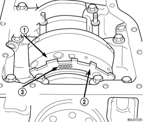 The main bearings are "select fit" to achieve proper oil clearances. For main bearing selection, the crankshaft position sensor target wheel (2) has grade identification marks (3) stamped into it. These marks are read from left to right, corresponding with journal number 1, 2, 3, 4. The crankshaft position sensor target wheel (2) is mounted to the number 6 counter weight (1) on the crankshaft.