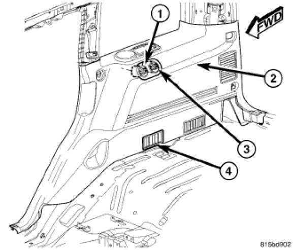 There is one rear floor air outlet (4) located behind the right rear door area in the right quarter interior trim panel. The airflow from the rear floor air outlet is directed by fixed vanes in the right quarter interior trim panel and cannot be adjusted. The rear floor air outlet is not serviceable.