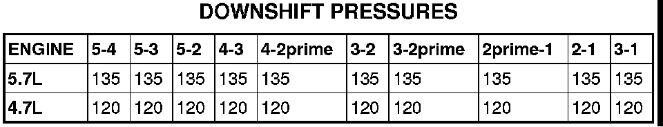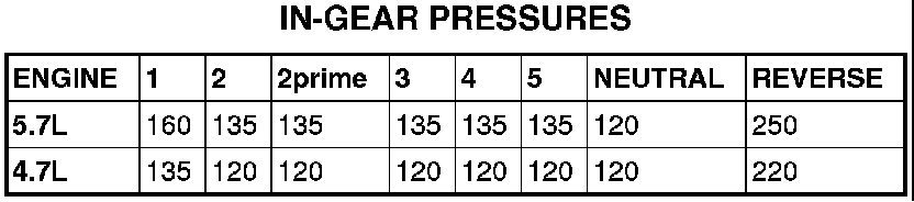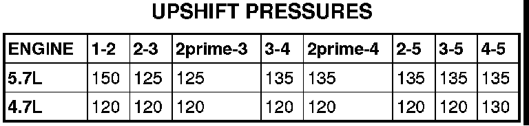 Some common pressures that can be measured to evaluate pump and clutch performance are the upshift/downshift pressures, garage shift pressures, and TCC pressure. The upshift/downshift pressure for all shifts are shown in UPSHIFT PRESSURES and DOWNSHIFT PRESSURES. In-gear maximum pressure for each gear position is shown in IN-GEAR PRESSURES. The garage shift pressure when performing a N-R shift is 220 psi for 4.7L equipped vehicles and 250 psi for 5.7L equipped vehicles. The garage shift pressure for the R-N shift is 120 psi. The garage shift pressure for the N-1 shift is 135 psi for 4.7L equipped vehicles and 165 psi for 5.7L equipped vehicles. Torque converter lock-up pressure is 120 psi for 4.7L equipped vehicles and 125 psi for 5.7L equipped vehicles.