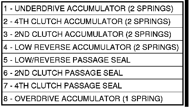 Inspect all the accumulator bores in the valve body. Use a penlight to view the bore interiors. Replace the valve body if any bores are distorted or scored. Inspect all of the accumulator springs. The springs must be free of distortion, warpage or broken coils.